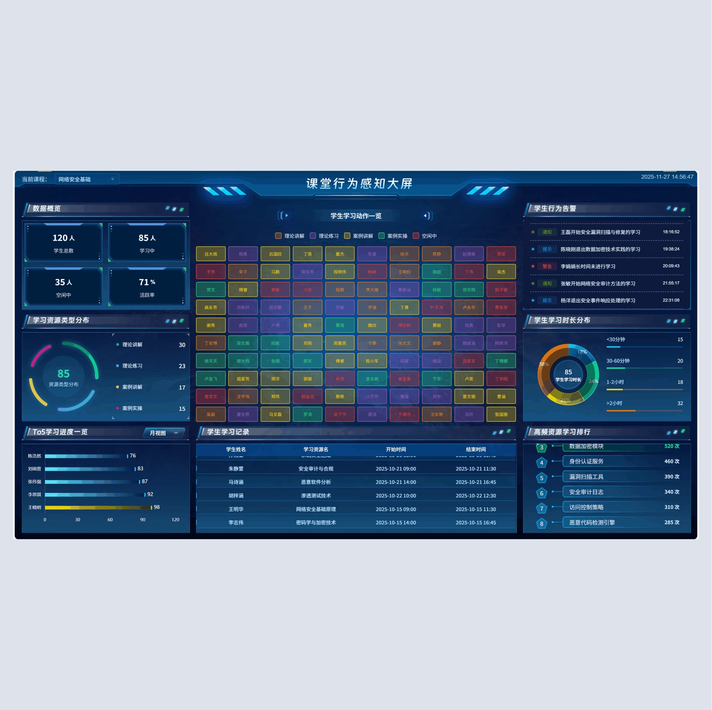教学驾驶舱是球迷屋官网问课平台的智能指挥中心,整合教学全流程数据,顺利获得可视化仪表盘的形式,为教师与教学管理者给予全面、实时的教学情况反馈。驾驶舱涵盖多维度数据指标,包括实时学习总人次、今日学习人次、学生总数、班级总数、各类型资源学习占比、热门课程学习排名、难点任务统计、学生活跃度趋势、各时段学习人次分布等。